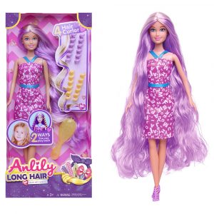 Anlily dukke med langt hår og redskap til å lage flotte krøller med.