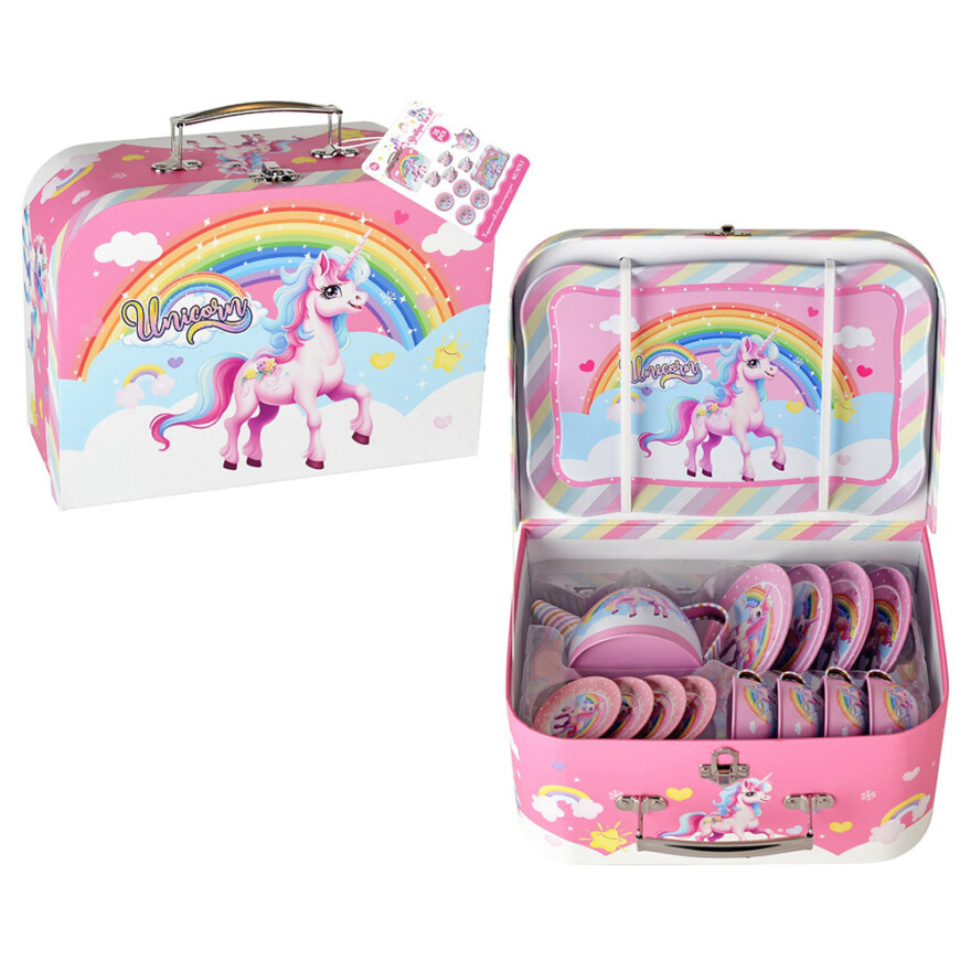 Dette nydelige koppesettet i tinn kommer i en flott koffert med enhjørningmotiv og inneholder alt som trengs for fantasifulle teselskaper. Med 16 deler, inkludert kopper, fat, tekanne og serveringsbrikke, er dette settet perfekt for barn som elsker rollelek og magiske øyeblikk.