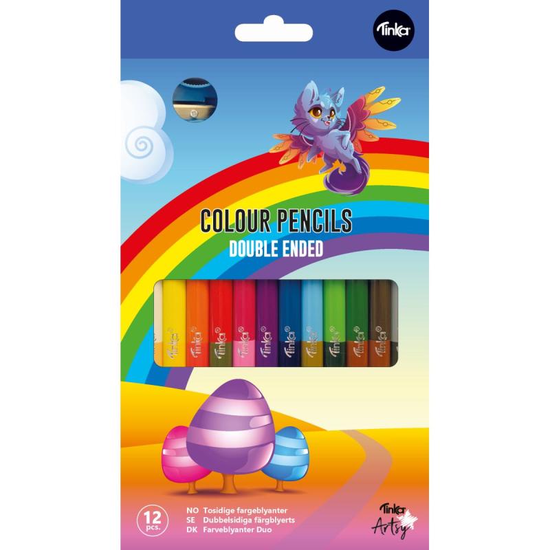 12 blyanter med 24 farger! Tofargede triangelformede blyanter med høy fargeintensitet. Gode å holde i, og er ideelle med tanke på utvikling av blyantgrepet. Lette å spisse, godt polstret og har en solid blyantkjerne. Gir myke strøk og har høy fargeintensitet. Blyantspisser er inkludert. Ikke giftige.