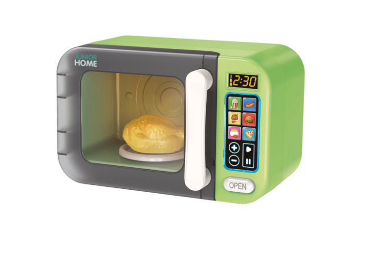 Mikrobølgeovnen har innvendig belysning og fast dreibar dreieskive, utvendig lys og lyder med funksjonsknapper. Velg maten som skal tilberedes, start ovnen og når den digitale timeren teller ned til null er maten ferdig og har endret farge. Ovnen lager en realistisk lyd når den lager mat og en dingslyd når lekematen er ferdig. Lekemikrobølgen kommer med plastmat og inkluderer 3 x AA-batterier. Fra 3 år.