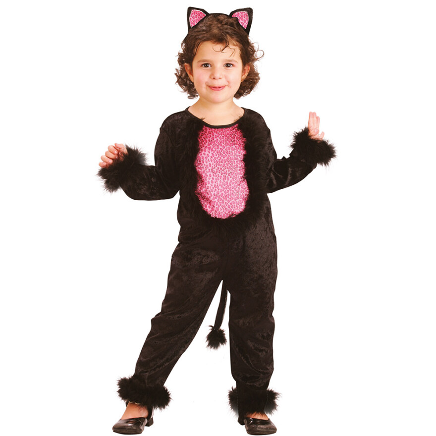 Klar for mjauende moro? Dette søte kattekostymet lar barnet leke seg inn i dyrenes verden med stil. Den svarte jumpsuiten har rosa leopardmønster på brystet og myk pelskant rundt håndledd og ankler. Medfølgende hårbøyle med katteører fullfører det sjarmerende uttrykket – perfekt for karneval, bursdager eller fantasifull lek hjemme.