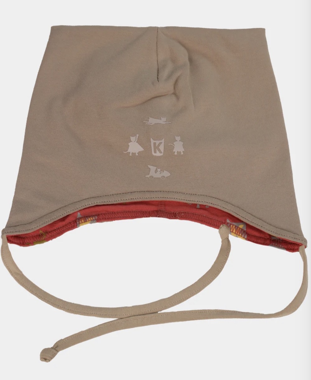Mjuk bomullslue i organisk bomull til dei aller minste. Med print frå kolleksjon "Superkatten - 2026". Kan vendast og brukast på begge sider. Matchar perfekt med Babyregndress Dugg og Babysmekke vendbar.