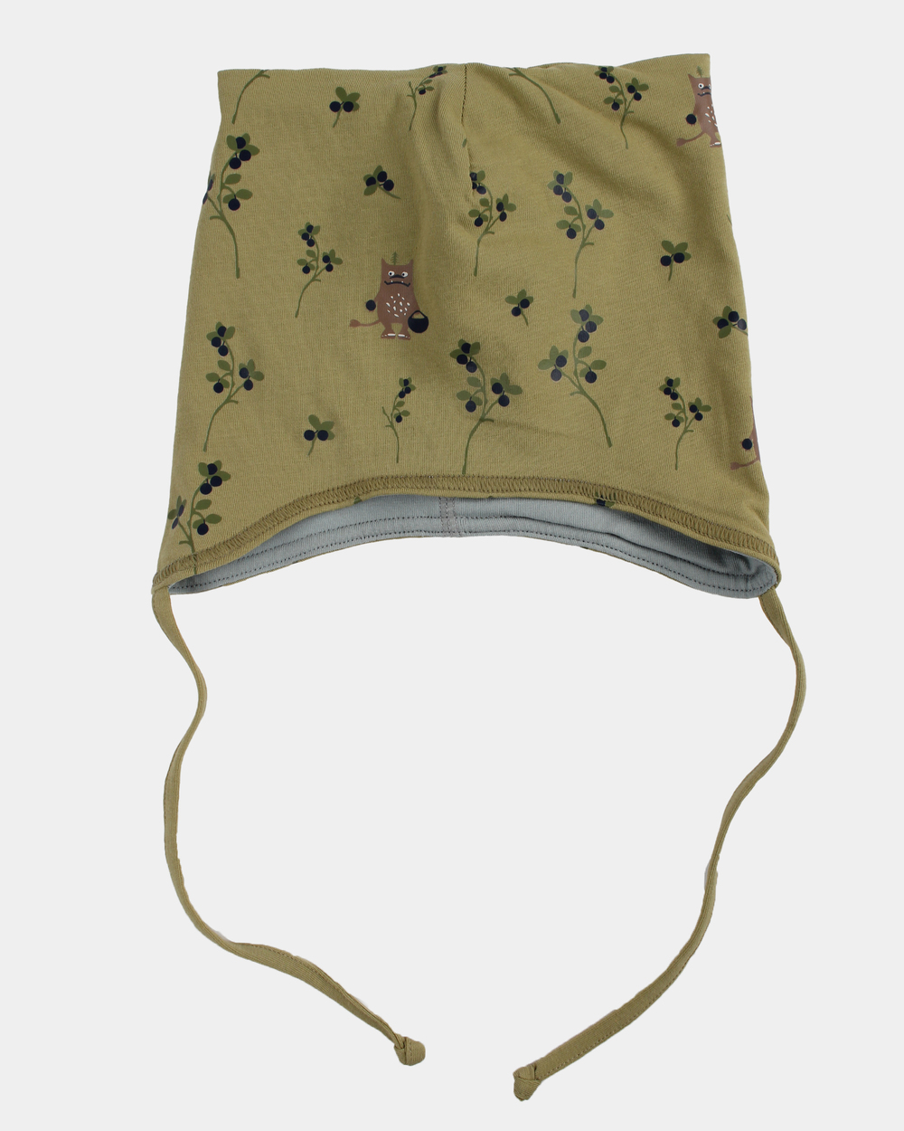 Mjuk bomullslue i organisk bomull til dei aller minste. Med print frå kolleksjon "Tolvmeterskogen - 2025". Kan vendast og brukast på begge sider.