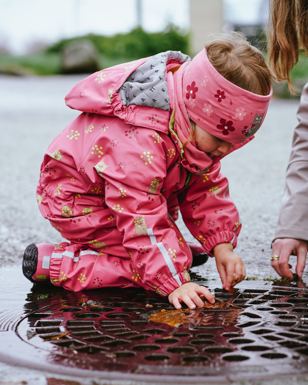 Heilårsregndress Hagl - kolleksjon "Tolvmeterskogen 2025". Den tradisjonelle Heilårsregndressen med vattering i både torso, ermer og bein. Denne regndressen tålar både øspøs regnvêr og mykje leik.