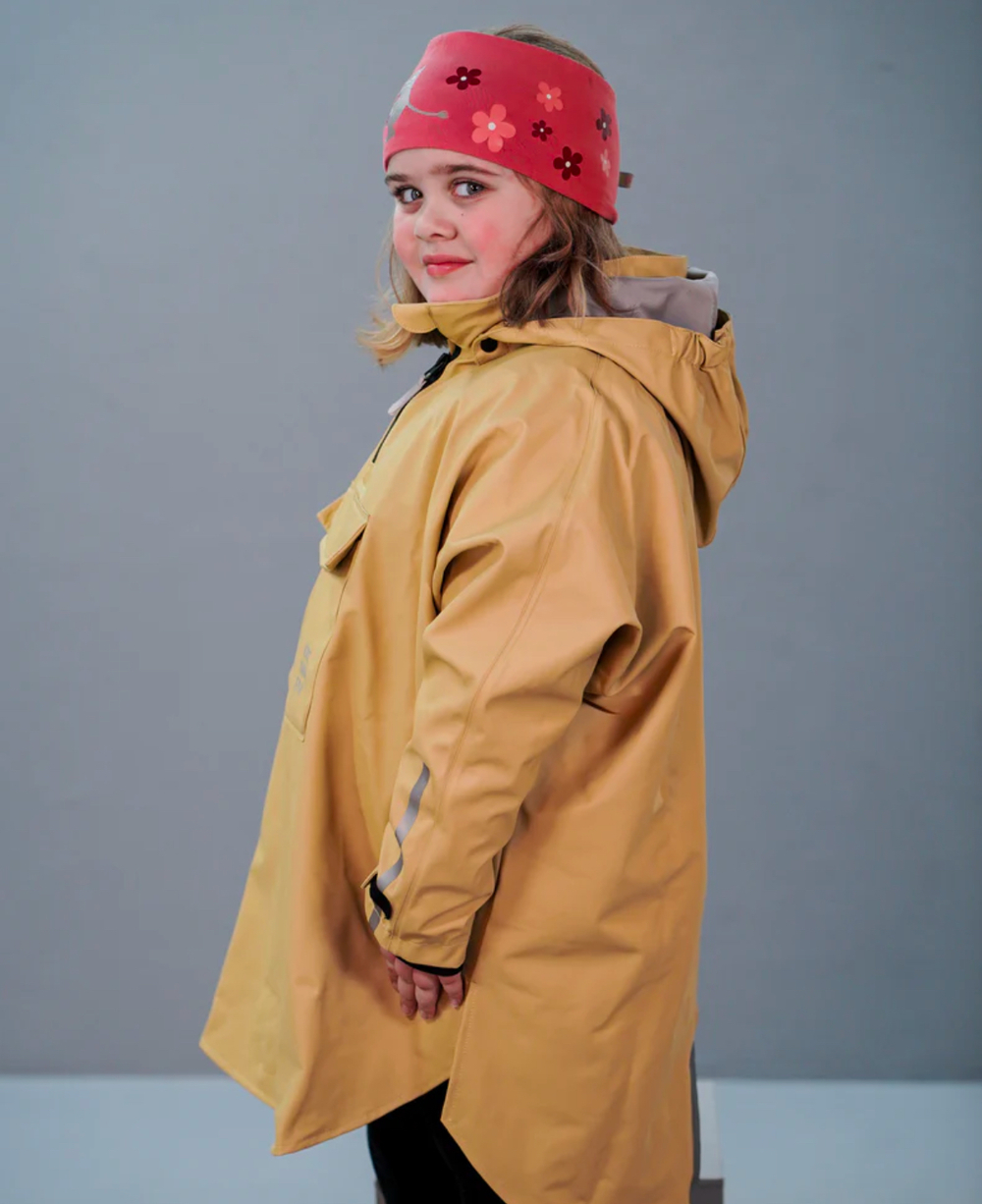 Regnponcho med ermer i mjuk PU knit som gir fint fall. Passformen er laus og størrelsane gode. Dette gjev moglegheit til betre bevegelse i leik.