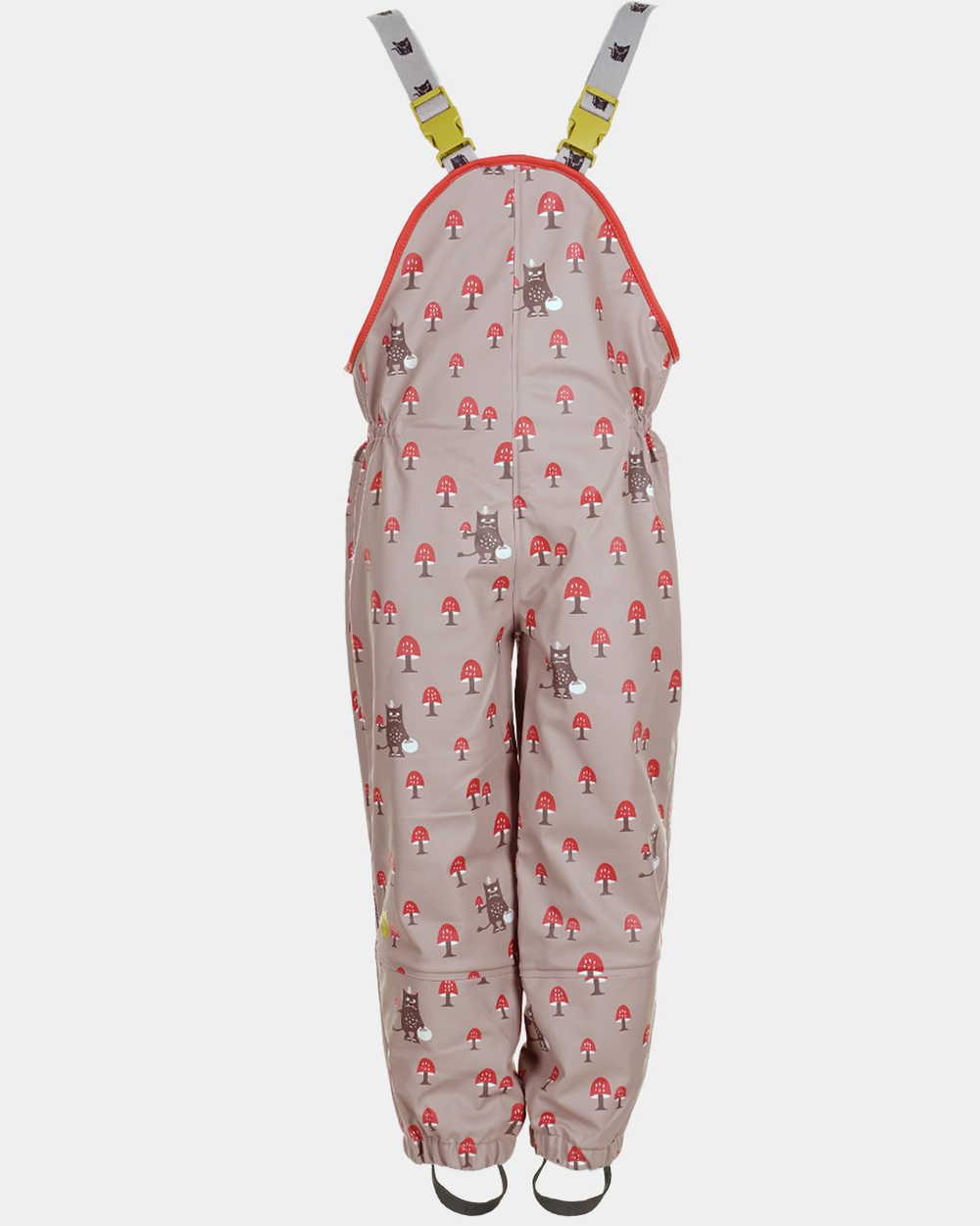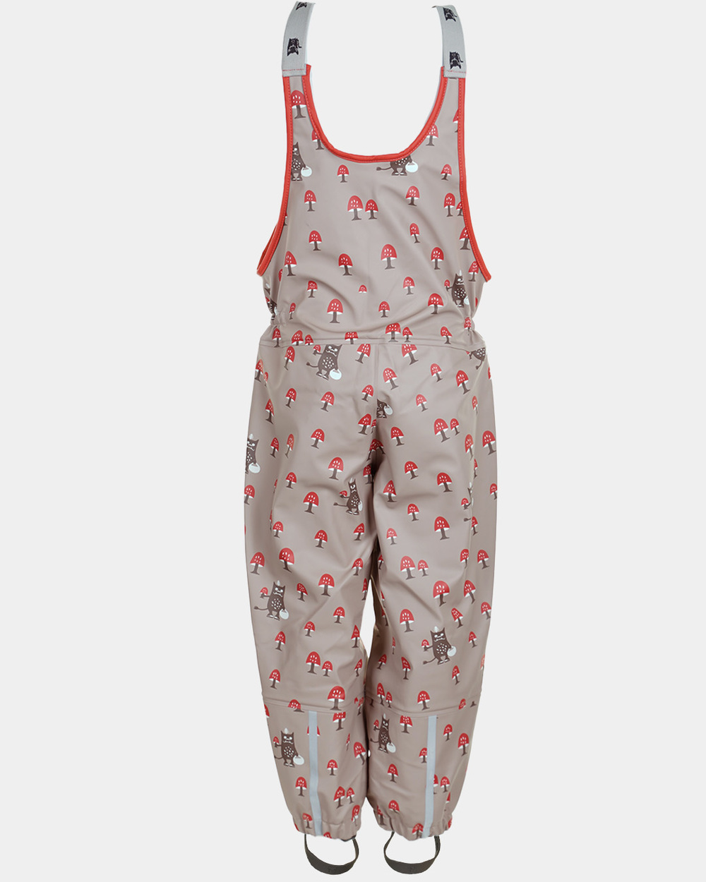 Her er både jakke og bukse i same gode PU kvalitet, med børsta innside. Det er mjuk fleece på insida av kragen og vannstopper finst i både ermer og bein. Her har me slitesterk gummistrikk under føtene, refleksar på jakke og bukse, og mykje moro i print og andre detaljar. Sveisa saumar og sikker hette som er både avtagbar og regulerbar.