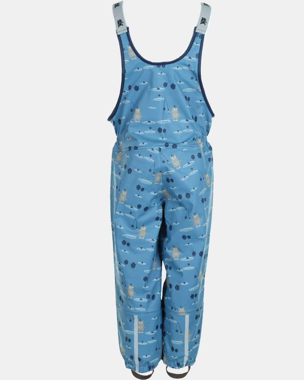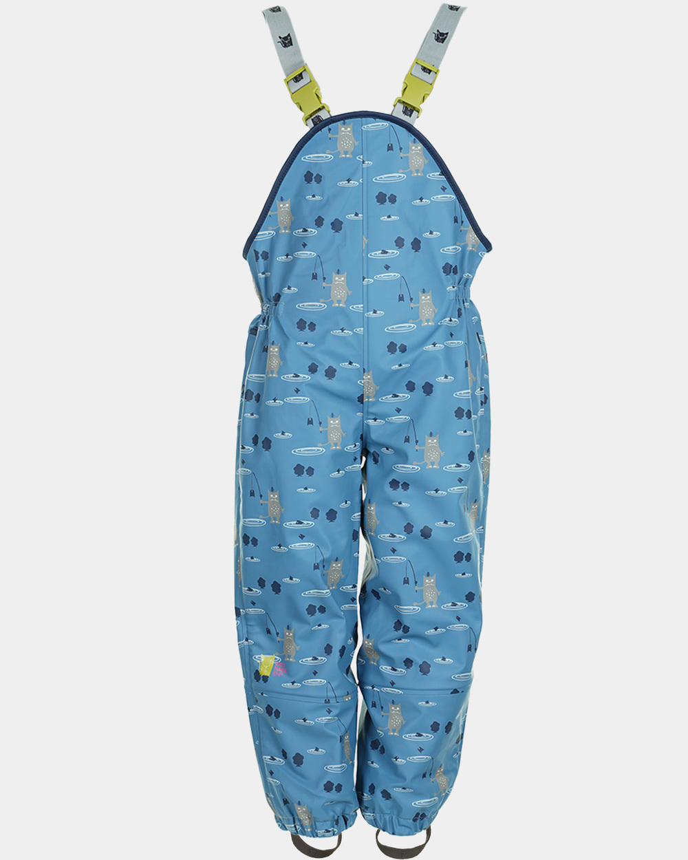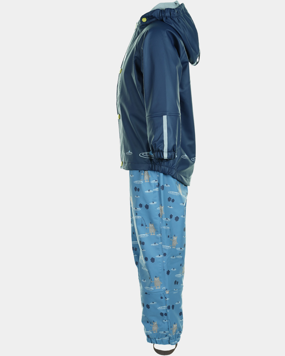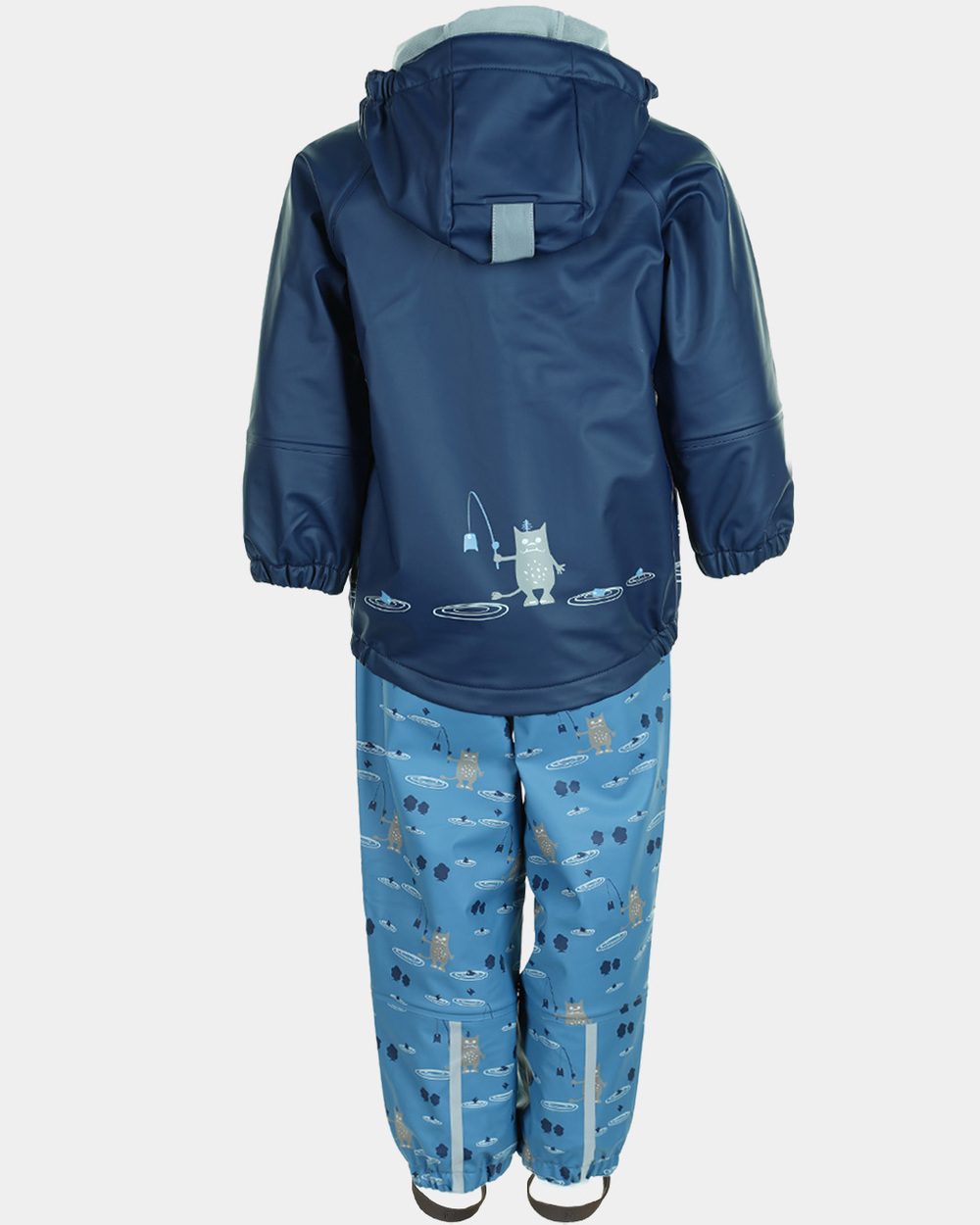 Her er både jakke og bukse i same gode PU kvalitet, med børsta innside. Det er mjuk fleece på insida av kragen og vannstopper finst i både ermer og bein. Her har me slitesterk gummistrikk under føtene, refleksar på jakke og bukse, og mykje moro i print og andre detaljar. Sveisa saumar og sikker hette som er både avtagbar og regulerbar.