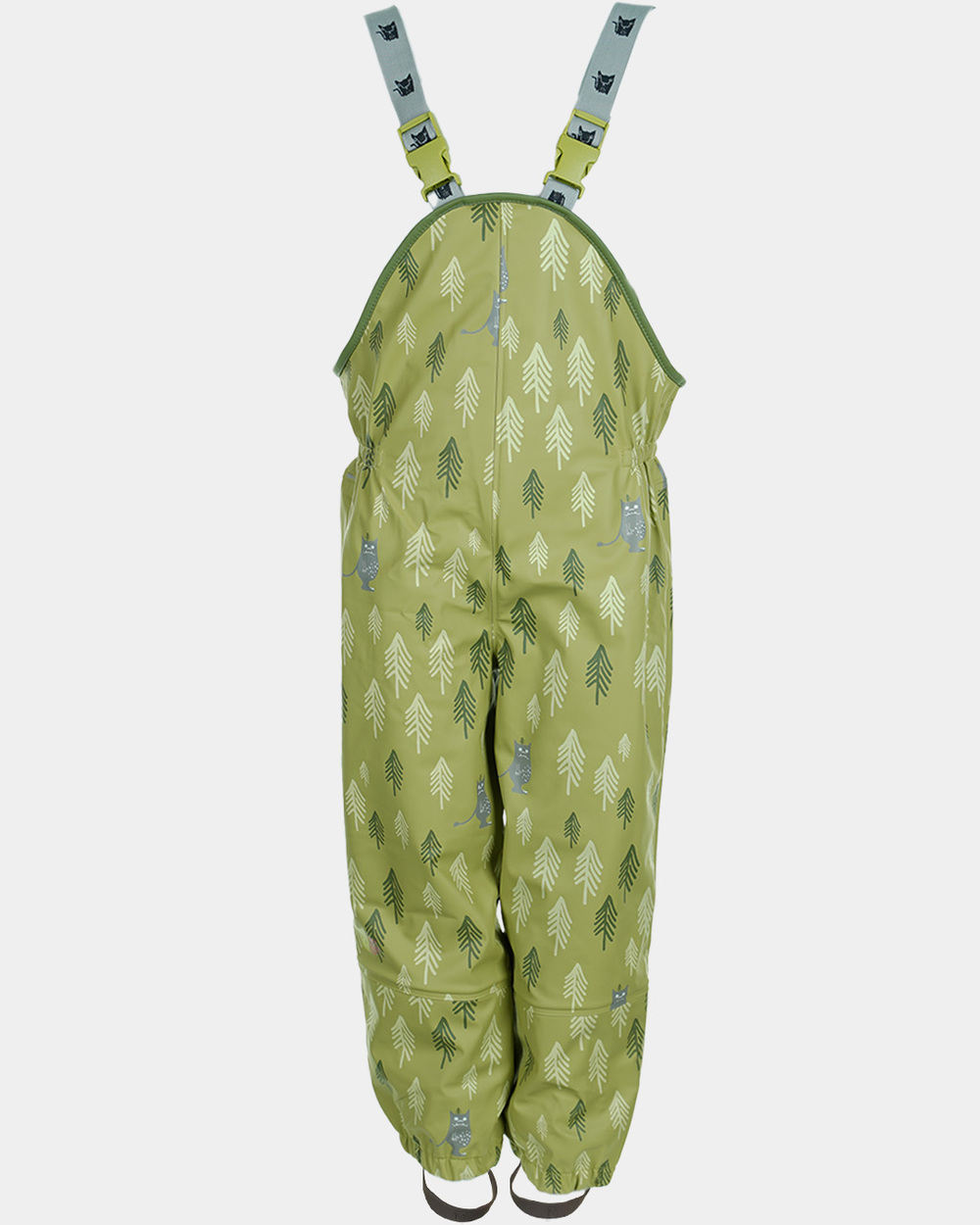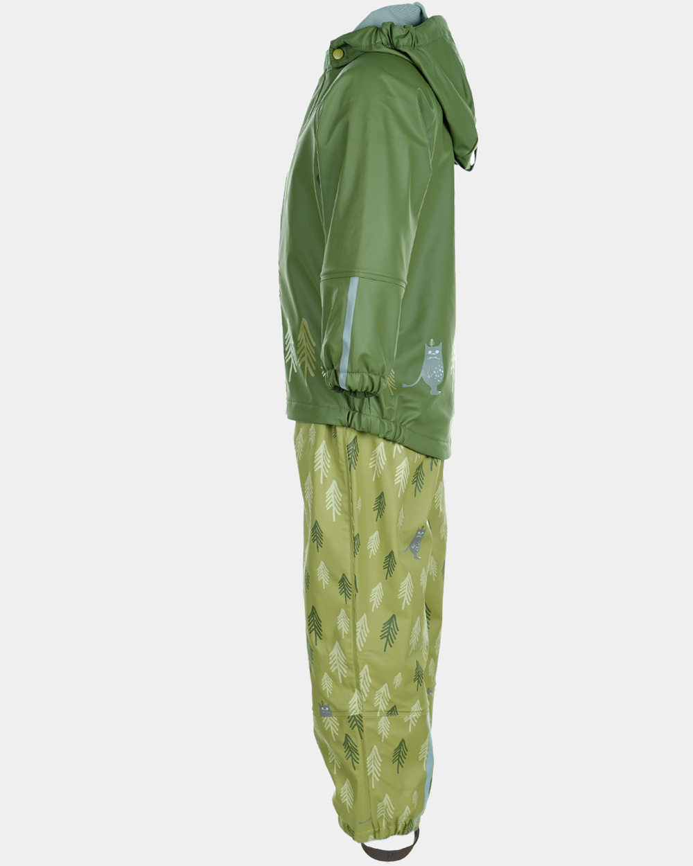Her er både jakke og bukse i same gode PU kvalitet, med børsta innside. Det er mjuk fleece på insida av kragen og vannstopper finst i både ermer og bein. Her har me slitesterk gummistrikk under føtene, refleksar på jakke og bukse, og mykje moro i print og andre detaljar. Sveisa saumar og sikker hette som er både avtagbar og regulerbar.