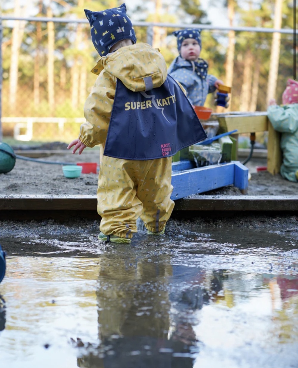 Denne lause superheltkappa frå kolleksjonen Superkatten 2026 kan festast på nesten alt regntøy i kolleksjonen vår (NB! gjeld ikkje Babyregndress Dugg). Me gjer det rett og slett berre på gøy – og fordi det skal vere lov å velje regntøy med eller utan kappe, alt etter humør og superheltambisjonar den dagen.