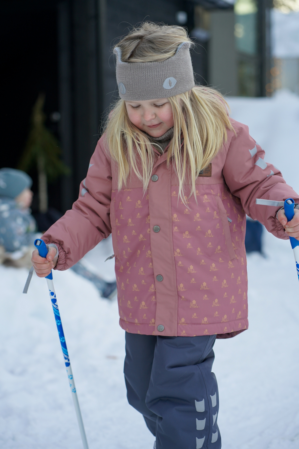 Vinterjakke Barn - kolleksjon «Tolvmeterskogen 2025». Laga for kalde vinterdager i 100 % nylon som er slitesterk (80 000 sykluser Martindale) og pustande (minst 5000 g/m2/24h). Dressen har ei vannsøyle på 12 000 og held borna tørre sjølv i våt snø. Foret er av vatt og tørker fort om ein vrenger den etter vask. Dressen er utstyrt med slitesterke fotstrikkar, namnelapp, refleksar på ermer, bein og rygg og snøstopp på ermer. Dressen har sikkerhetshette som om er både avtagbar og regulerbar.