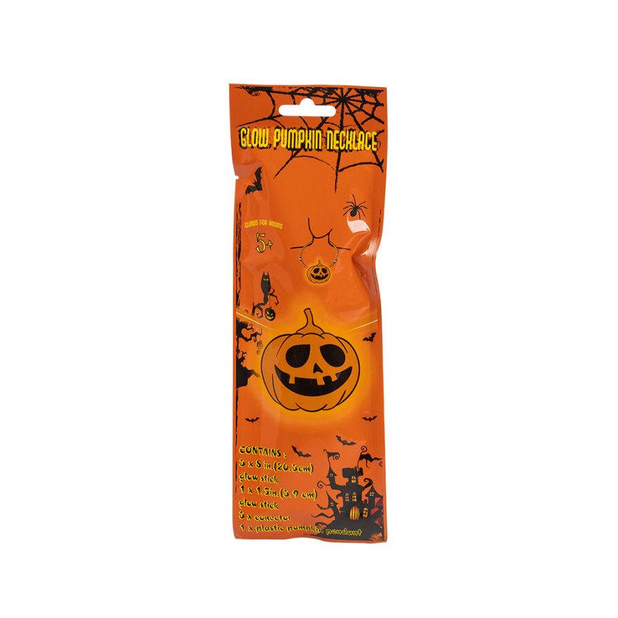 Stilige halskjeder som lyser. Velg mellom skummelt gresskar eller spøkelse. Passer fint til halloween og utkledning.
