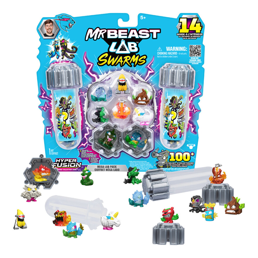 MrBeast Lab Swarms Fusion 14 pk er en spennende samlerpakke for barn som elsker overraskelser og figurer. Åpne reagensglassene og avslør hele 14 Hyper Fusion Swarms-figurer – kanskje finner du den sjeldne limited edition Hyper Fusion Panter? Med over 100 figurer å samle på fra ulike Mikro Beast-team, er det alltid noe nytt å oppdage. De medfølgende Fusions-hettene fungerer som utstillingsstativ, slik at barna kan bygge sitt eget display og vise frem favorittene. Perfekt for lek, samling og kreativ utstilling.