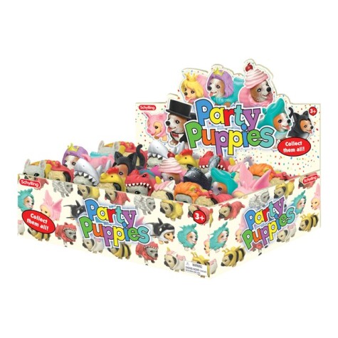 Party Puppies er små valper som er klare til å feste. De er morsomme å klemme på og å samle på fordi de alle er kledd på sin egen måte. De passer rett i lommen og elsker å reise med eierne sine. Valpene er myke og elastiske og er alle kledd i en morsom, elastisk drakt. Drakten kan tas av og byttes rundt på blant valpene. Hvorfor ikke samle dem alle og lage en kostymefest med disse kjære hundene? Fra 3 år.