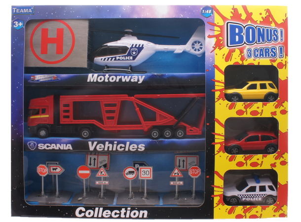 Stort bilsett som inneholder trasporter, helikopter med lander, 12 skilt og hele tre biler!