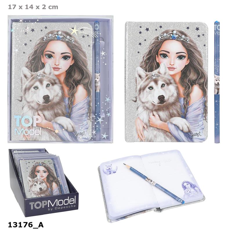 TOPModellen Janet, en magisk ulv og vakre stjerner foran masse sølvglitter - notisboken fra TOPModel-serien WOLF er et skikkelig blikkfang der alt glitrer. Inkl. en matchende blyant med ulvemotiv. Sidene i boka er illustrert i mystisk blå og har fine linjer.