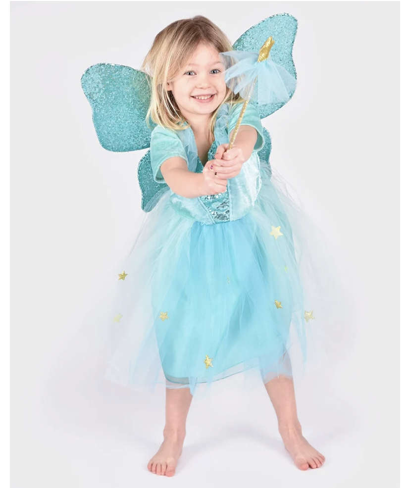 Den gode feen Fe turkis kjole med englevinger og stav 8-9år