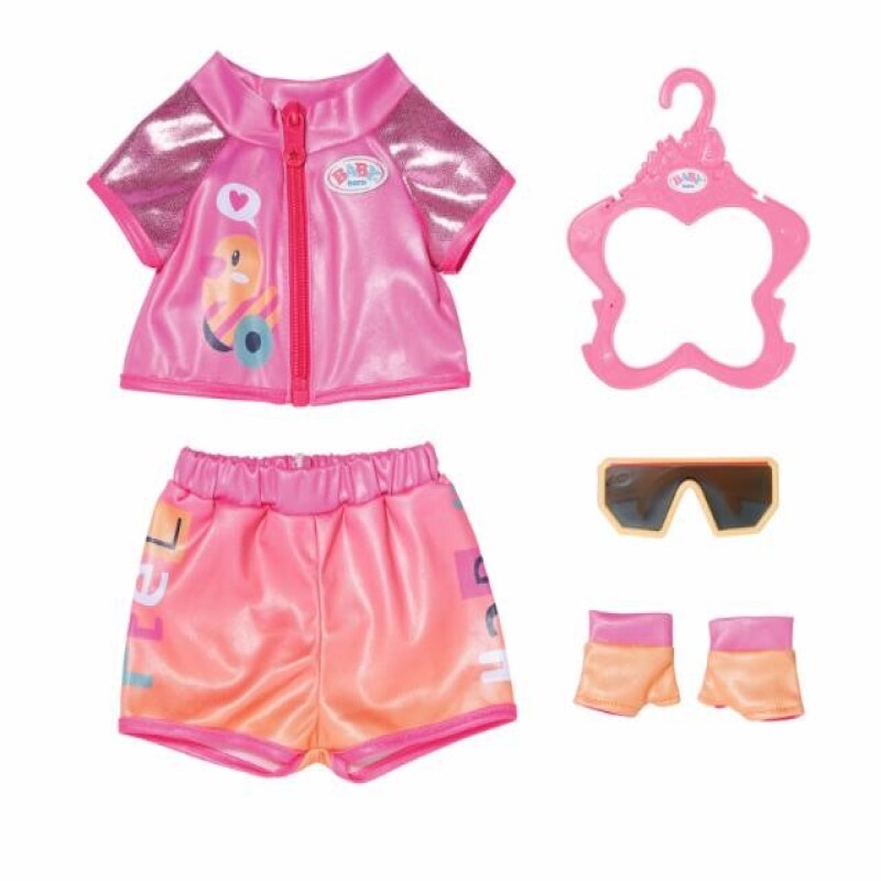 Å kjøre på to eller trehjulsykkel er dobbelt så gøy når du har et sporty sykkeloutfit som dette! Settet med shorts og bluse i fargene rosa og oransje vekker virkelig oppsikt og blir komplett med matchende hansker og solbriller. BABY born og BABY born bamse har aldri sett så bra ut på en sykkeltur.