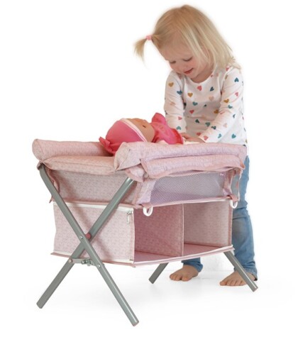 Sørg for at dukken din alltid er fint påkledd for dagen med dette fine skiftebordet. Dukken ligger behagelig på det rosa stoffet, og under gjemmer det seg smarte oppbevaringsrom hvor bleier og tåteflasker kan ligge klare. Fra 3 år.