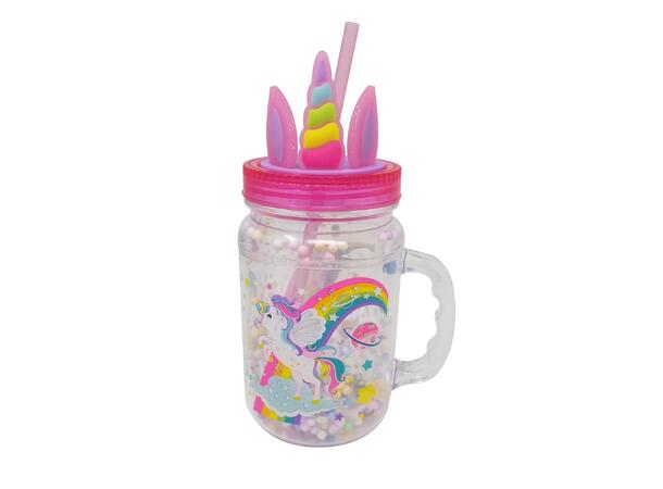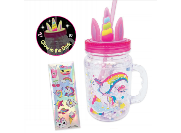 Med sitt glød-i-mørket-design, svevende perler og det ikoniske enhjørningshornet som lokk, blir hver slurk et eventyr.