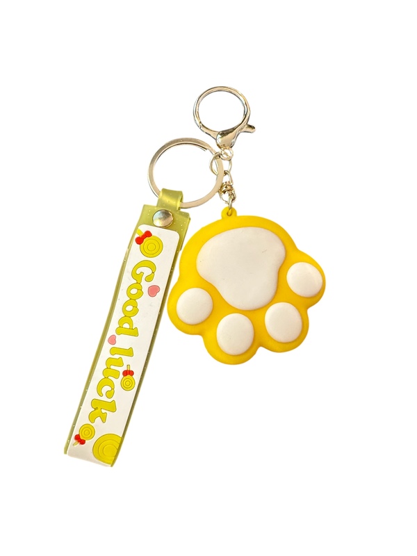 Nøkkelring med forskjellige farger på potene og "good luck" charmen