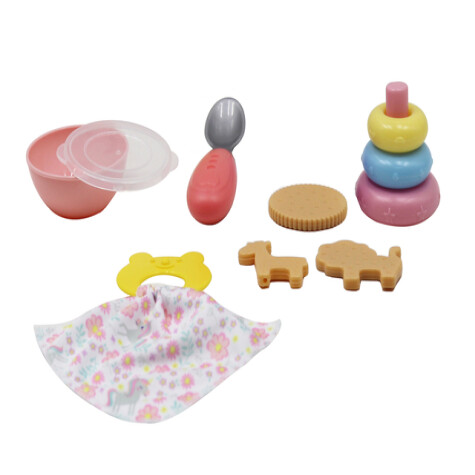 Nå er det leketid for de minste. Inspirer barnet ditt til fantasifull leking med dette lekesettet som består av en bolle med lokk, skje, 3 kjeks, en koseklut med bitering og stabletårn. Fra 24 måneder.