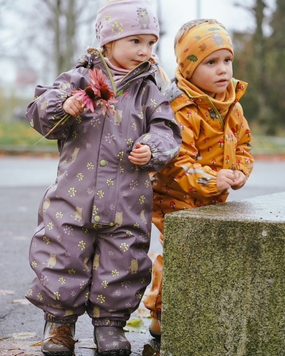 Heilårsregndress Hagl - kolleksjon "Tolvmeterskogen 2025". Den tradisjonelle Heilårsregndressen med vattering i både torso, ermer og bein. Denne regndressen tålar både øspøs regnvêr og mykje leik.