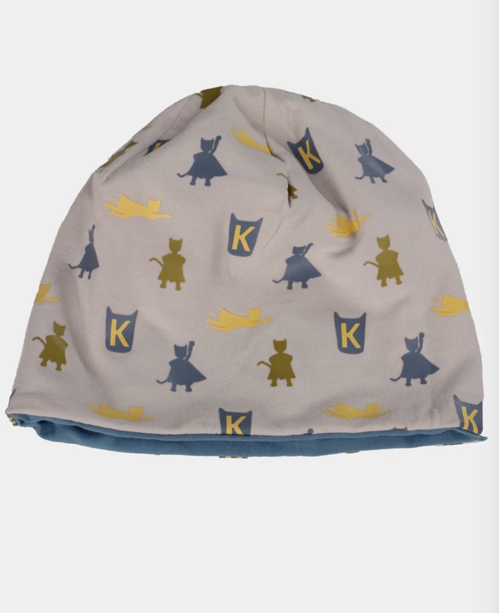 Mjuk bomullslue med print frå kolleksjon "Superkatten - 2026" som kan vendast og brukast på begge sider.
