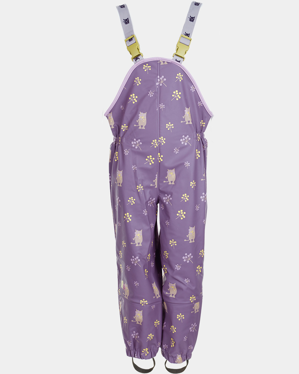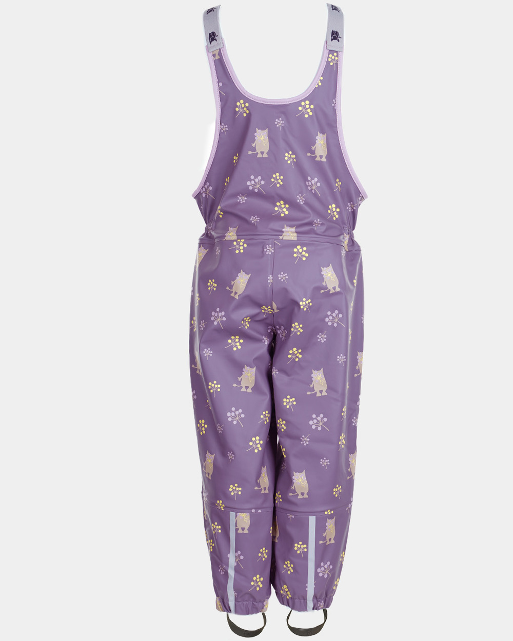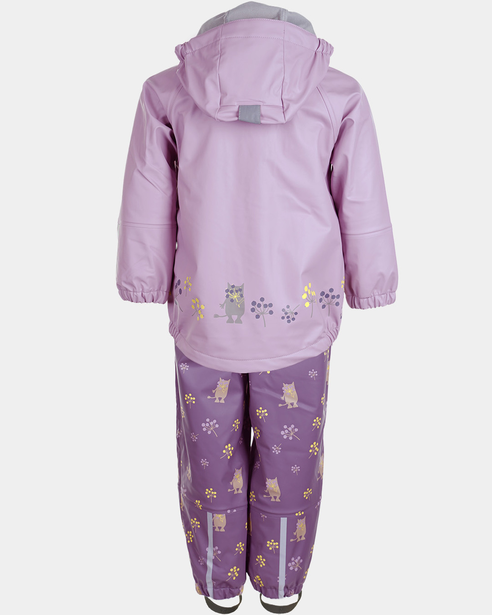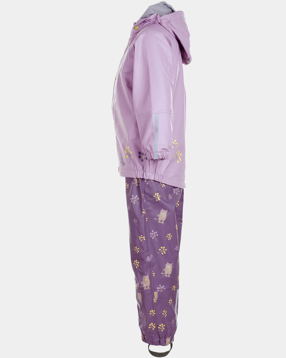 Her er både jakke og bukse i same gode PU kvalitet, med børsta innside. Det er mjuk fleece på insida av kragen og vannstopper finst i både ermer og bein. Her har me slitesterk gummistrikk under føtene, refleksar på jakke og bukse, og mykje moro i print og andre detaljar. Sveisa saumar og sikker hette som er både avtagbar og regulerbar.