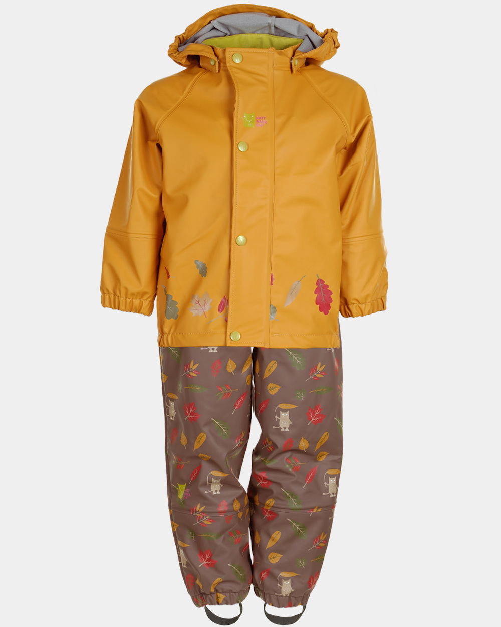 Her er både jakke og bukse i same gode PU kvalitet, med børsta innside. Det er mjuk fleece på insida av kragen og vannstopper finst i både ermer og bein. Her har me slitesterk gummistrikk under føtene, refleksar på jakke og bukse, og mykje moro i print og andre detaljar. Sveisa saumar og sikker hette som er både avtagbar og regulerbar.