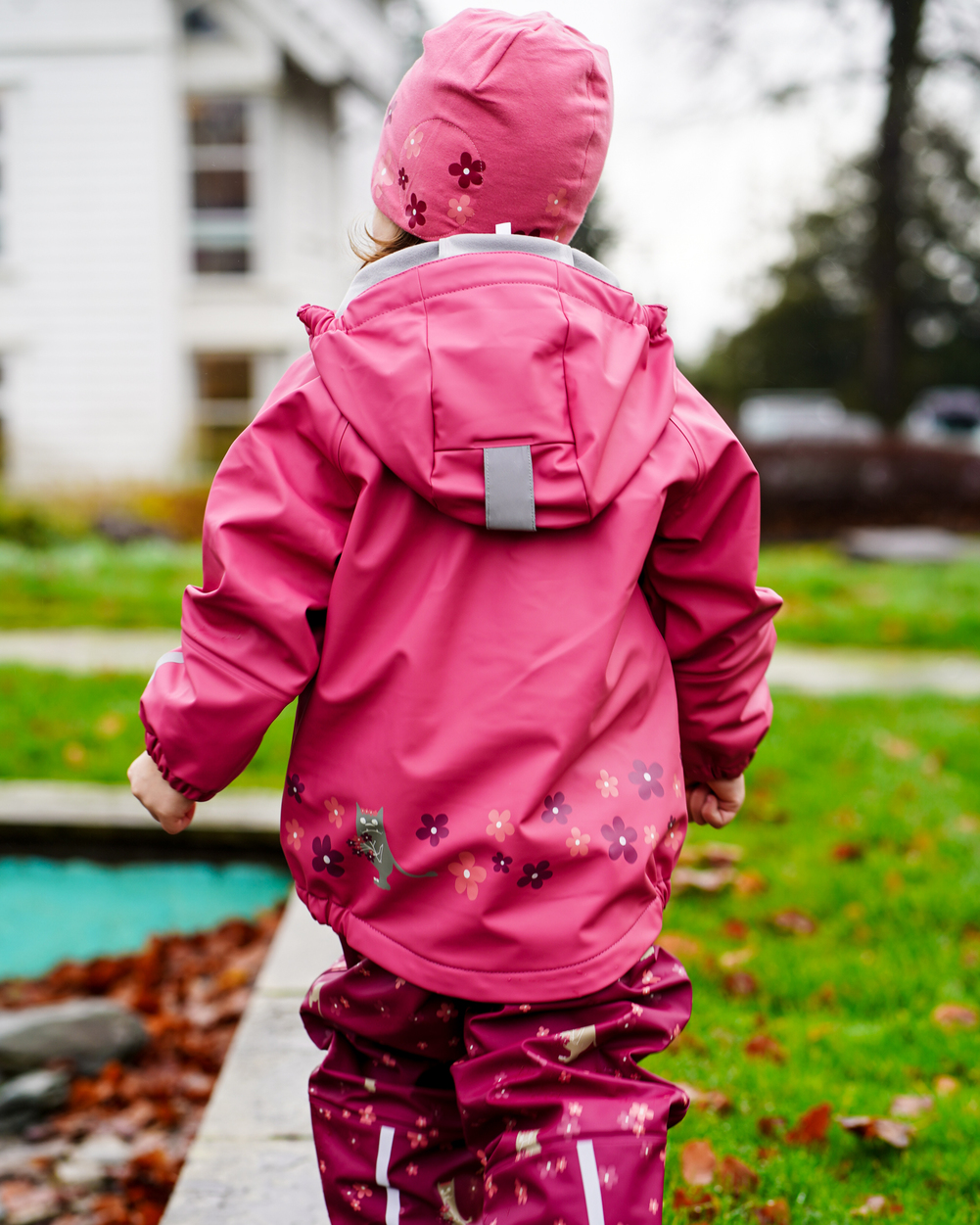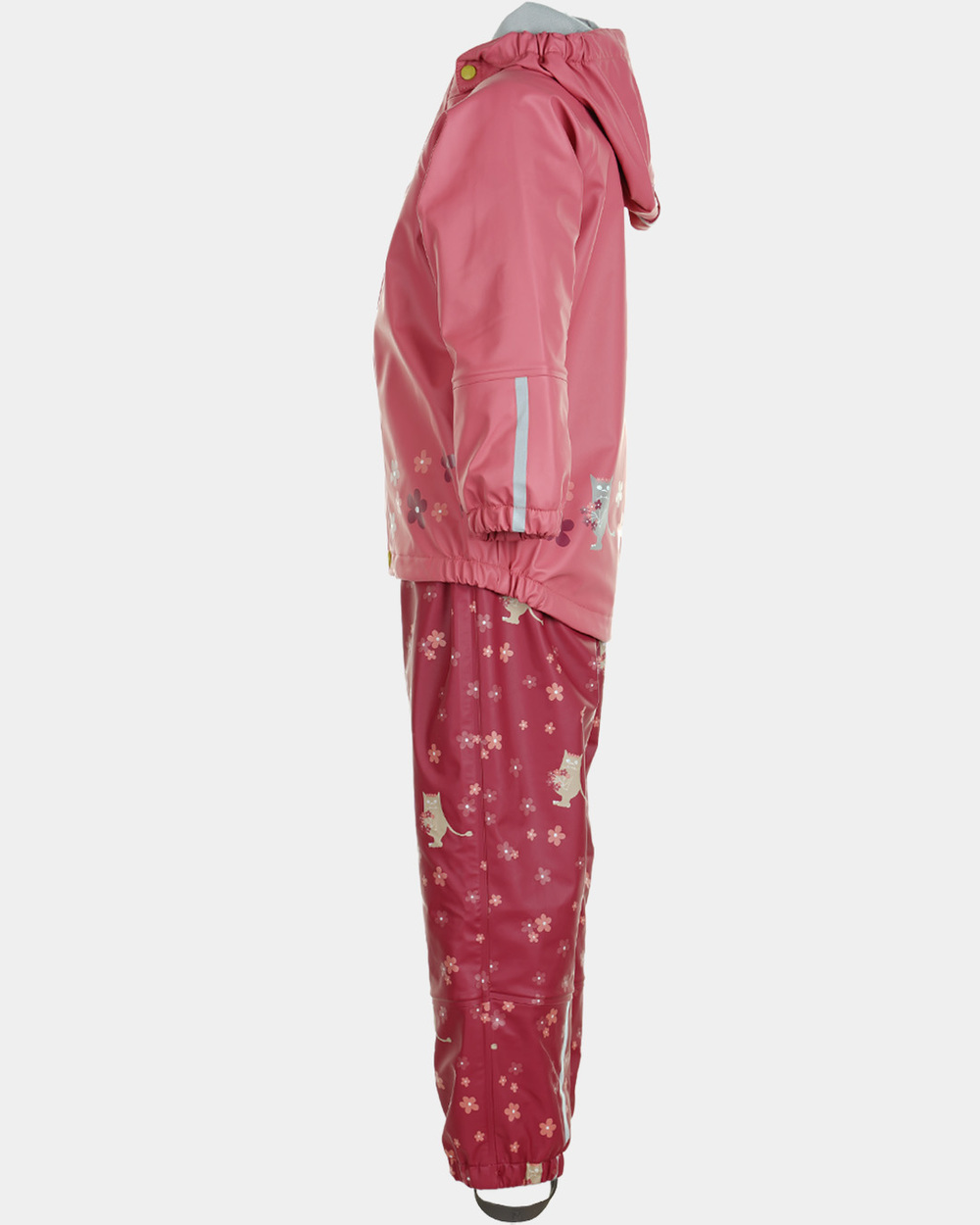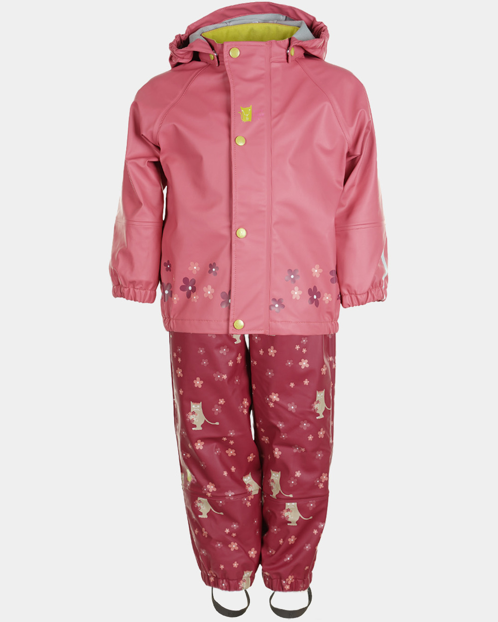 Her er både jakke og bukse i same gode PU kvalitet, med børsta innside. Det er mjuk fleece på insida av kragen og vannstopper finst i både ermer og bein. Her har me slitesterk gummistrikk under føtene, refleksar på jakke og bukse, og mykje moro i print og andre detaljar. Sveisa saumar og sikker hette som er både avtagbar og regulerbar.