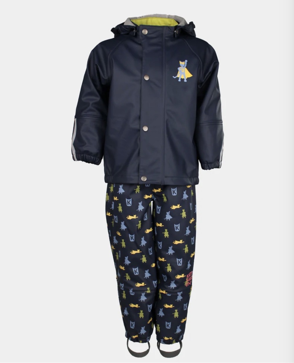 Regnsett Plask kjem i fleire stilige fargar og mønster frå Superkatten-universet. Ønskjer barnet seg kappe? Då kan du enkelt kjøpe laus superheltkappe og feste ho under hetta – klar for nye superheltoppdrag ?
