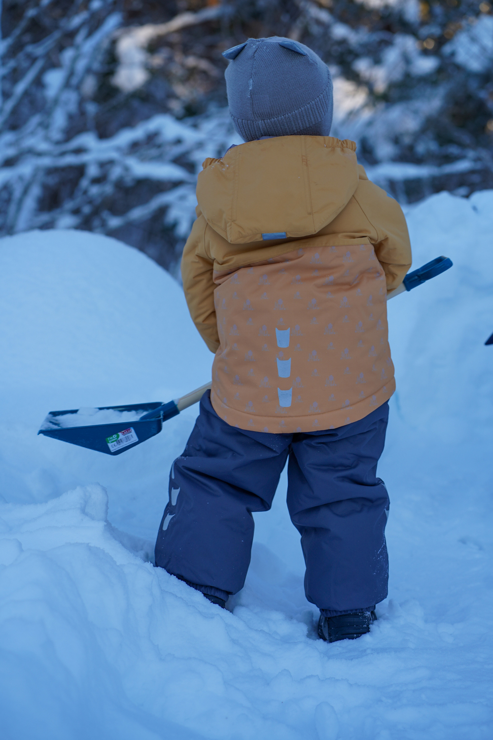 Vinterjakke Barn - kolleksjon «Tolvmeterskogen 2025». Laga for kalde vinterdager i 100 % nylon som er slitesterk (80 000 sykluser Martindale) og pustande (minst 5000 g/m2/24h). Dressen har ei vannsøyle på 12 000 og held borna tørre sjølv i våt snø. Foret er av vatt og tørker fort om ein vrenger den etter vask. Dressen er utstyrt med slitesterke fotstrikkar, namnelapp, refleksar på ermer, bein og rygg og snøstopp på ermer. Dressen har sikkerhetshette som om er både avtagbar og regulerbar.