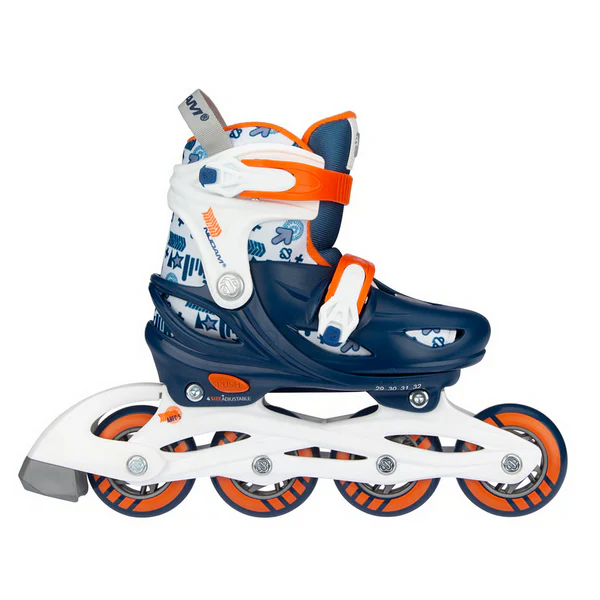 Justerbare rulleskøyter, justerbare i fire størrelser med et enkelt knappesystem. Utstyrt med bremser.