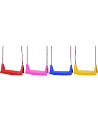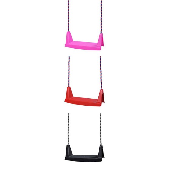 Huske, komplett med tau. Bredde 41 cm. Sorterte farger rosa, svart og rødt. Produsert av Plasto på Åland. Anbefalt alder fra 2 år og oppover.