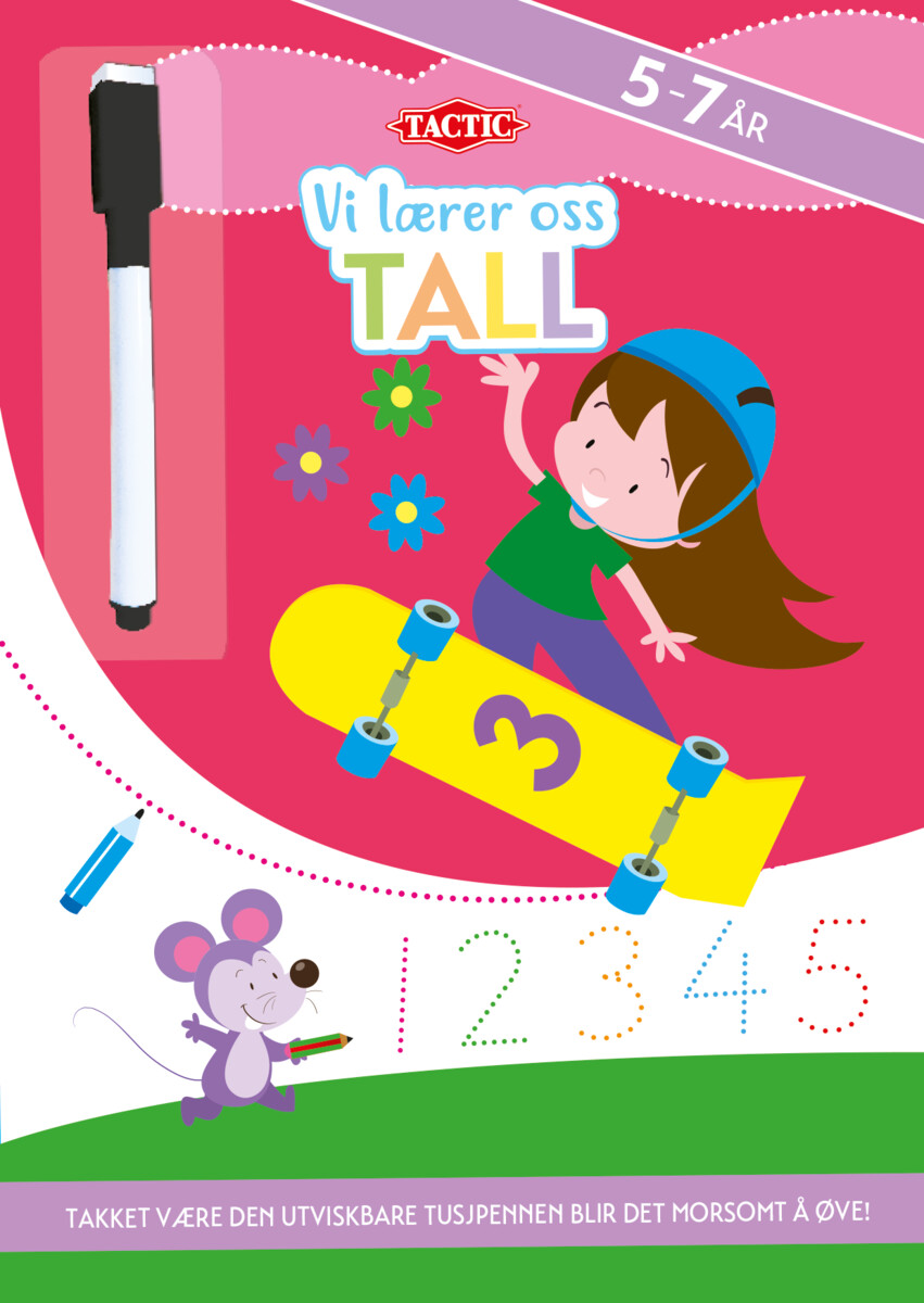Vi lærer oss å tegne tall, å telle og å forstå tall. Hopp inn i tallenes verden med morsomme oppgaver og lystige tegninger. Inkluderer tusjtavle-tusj med svamp. Du kan øve igjen og igjen!